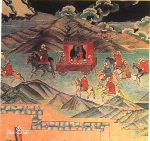 貞觀15年(641)正月十五,唐太宗將文成公主下嫁松贊干布,詔令江夏王李道宗持節(jié)護送。文成公主在唐送親使江夏王太宗族弟李道宗和吐蕃迎親專使祿東贊的伴隨下,前往吐蕃。文成公主一行從長安出發(fā),途經(jīng)西寧,翻日月山,長途跋涉到達拉薩。 松贊干布率群臣到河源附近的柏海(今青海瑪多縣境內(nèi))迎接文成公主,謁見李道宗,行子婿之禮。之后與公主同返邏些(今拉薩),為公主筑城、修建宮室。