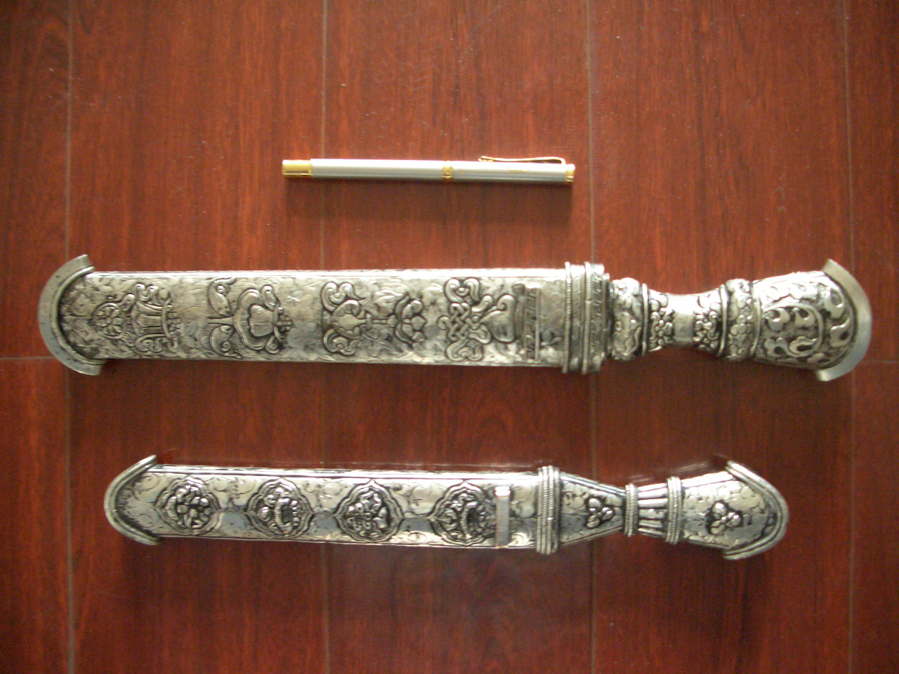 藏刀具有生產(chǎn)、生活、自衛(wèi)、裝飾4種用途,已有1600多年的生產(chǎn)歷史,做工講究,刀身用鋼材鍛,刀柄用牛角或硬質木料加工而成。從規(guī)格尺寸上分,藏刀大致為長刀、短刀和小刀三種。長刀最長的有一米多,短刀約40厘米左右,小刀則僅有十幾厘米長。從形狀上講,具有很強的地方特色,有牧區(qū)式、康巴式、后藏式等區(qū)別;用途也有很多種,如林區(qū)砍樹有專門的砍樹刀,屠夫用的屠宰刀等。 藏刀把多用以牛角、牛骨或木材制成,較高檔的刀把用銀絲、銅絲等纏繞,刀鞘則更為講究,較簡單的有木鞘或皮套外,多數(shù)是包黃銅、白銅,甚至包白銀、鍍金等,上面刻有精美的飛禽走獸及花草等各種圖案,有的還鑲嵌各種寶石、彩石,顯得華麗和富有。拉孜生產(chǎn)的藏力,歷史悠久,樣式美觀,淬火適中,刀刃鋒銳,再配上精致、貴重的刀鞘,雕著龍、鳳、虎、獅和錦花圖案,精美的藏刀大都出自能工巧匠之手。由于鍛打精致,鐫刻細膩,色彩奪目,并附有藏文,系有五顏六色柄穗,形成別具一格的藏族工藝品。藏刀的主要加工材料有銀、銅(白銅、黃銅、紫銅)、鐵、鯊魚、牛角、瑪瑙、硬雜木等。過程有冶煉熔化、模具翻鑄、敲摳大形、刻花鑲嵌、焊接組合、加固、銼磨整形、精雕細刻及鎂洗拋光等工序。