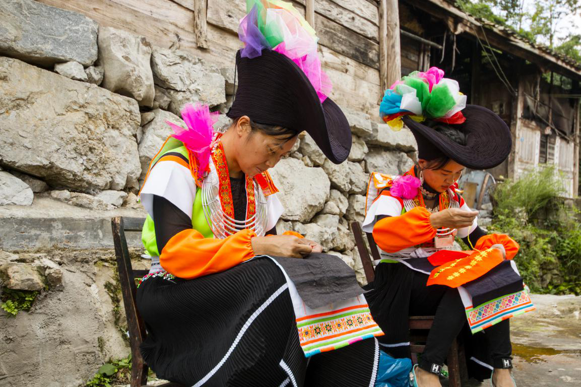 而批林村的女子傳統(tǒng)服飾較之男子則略顯復(fù)雜。批林村女子上衣以短袖開衫服飾為主,短袖開衫服飾顏色多變。在短袖開衫上還需戴上刺繡而成的背牌,背牌分為兩扇,一前一后。后背牌較大,但較短。前背牌較長,長至腰,背牌系帶上繡有圖案,以花草為主,顏色多變,前背牌需要用腰帶系住。批林村年輕女子在背牌之上還會帶上銀飾,胸前銀飾以銀圈為主。后背則是一串圖案銀飾,圖案多花草。除了前后背牌有銀飾外,前后背牌系帶上也有圓形雕花銀飾。批林村女子下裳則是以百褶裙為主,百褶裙顏色多以黑色為主,在下裙擺繡以白邊。百褶裙前還有系有兩層黑色圍腰,身后有三條彩帶自腰間垂下,垂至小腿。彩帶顏色亮麗,圖案優(yōu)美。批林村女子頭飾是用六米長的青褐布折成,形式像一只船,稱為百褶帽,常用重大節(jié)慶,一些女子還會在百褶帽上繡上彩巾。