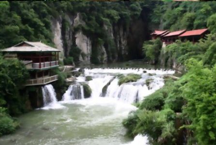 水洞下游有臥龍湖,水清可鑒,湖邊排列著水車、水碾、水磨、“香粑車”等等往時鄉(xiāng)間常見的農(nóng)家物,給人以既古樸又清新的感覺。與臥龍湖相連的是一處罕見的鈣化灘,足有200米長,灘面上瀑布流瀉,水簾溶洞星羅棋布,植被茂密,堪稱喀斯特景貌的一絕。這一帶,春來桃花爛漫,夏臨蘭草吐芳,金秋野菊盛開,初冬火棘紅艷,一年四季,風(fēng)景如畫。